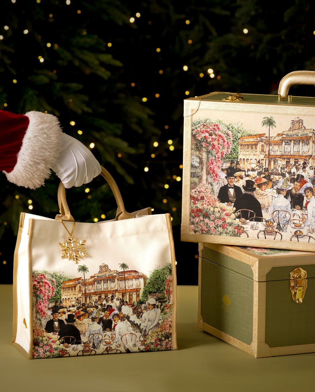 the design avoids loud logos in favor of a heritage-inspired illustration. The detailed artwork depicts a high-society gathering at The Mandarin Oriental Hotel in a bygone era, effectively communicating the brand’s "Heritage" and "Exclusivity." This approach transforms the bag into a collectible piece of history rather than just a branded commodity.